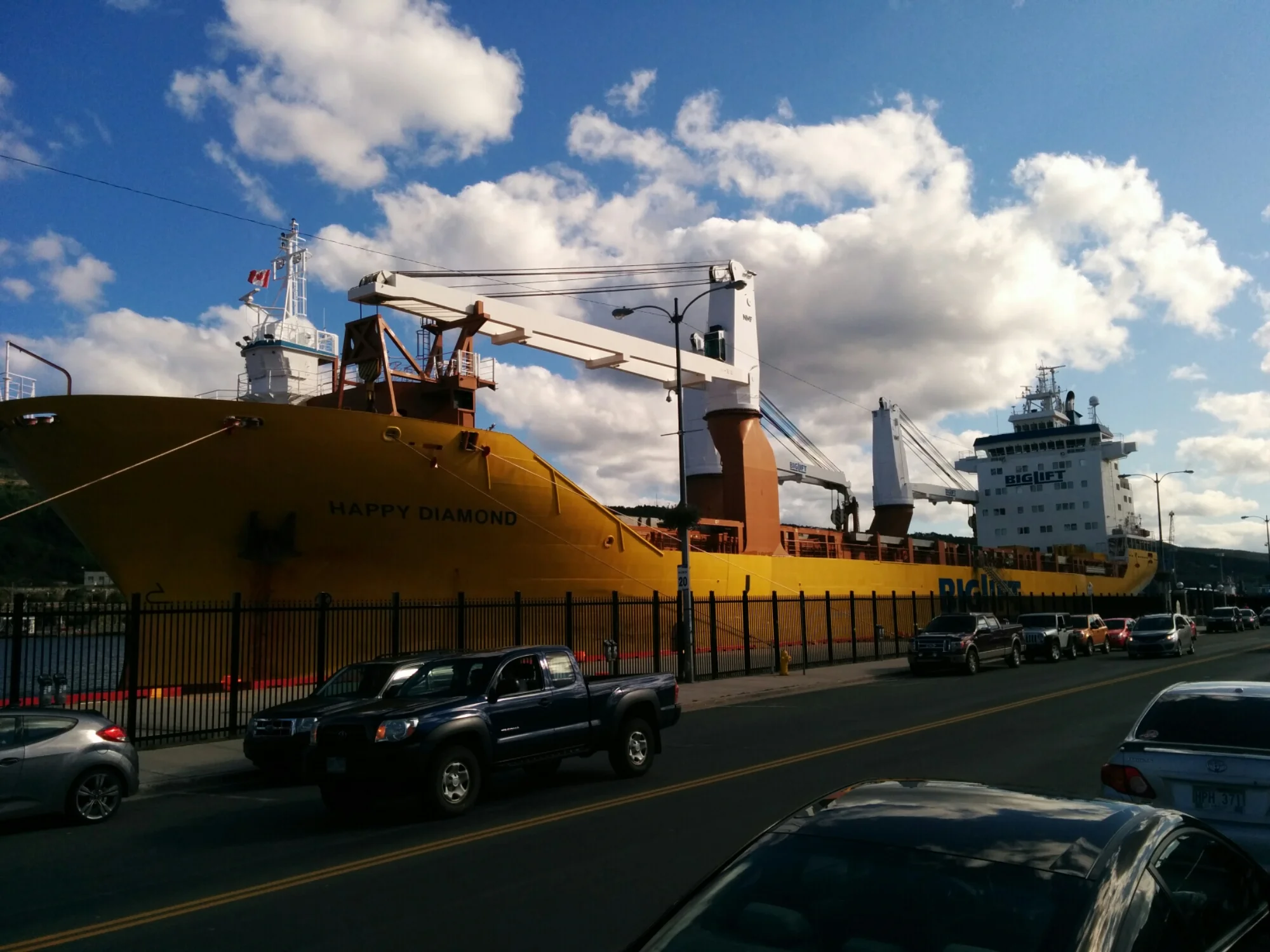 The Happy Diamond has been making trips in and out of the harbour all summer, and for a ship with such a cute name, you wouldn't expect to see the massive hull tied off along the harbour front. This ship is a heavy lift vessel, equipped with two massive cranes capable of lifting 400 metric tonnes, and one slightly smaller massive crane that can lift up to 120 metric tonnes. They're designed in such a way that even with the cranes reaching out at their full extension, the vessel doesn't need to be stabilized with pontoons to keep it from rolling. Additionally, her class of vessel (BigLift Happy D-Class), is certified to sail with open cargo hatches, which means that she can handle low sitting and high sitting cargos.